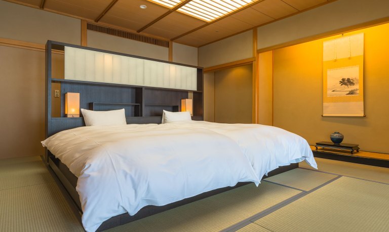 ホテルは休むことがメインの目的であるため、高品質なベッドを中心とした広々とした間取り構成となっています。そしてくつろぎのためのソファや品の良いコーヒーテーブル、といったような家具は、空間に溶け込むような調和を見せています。