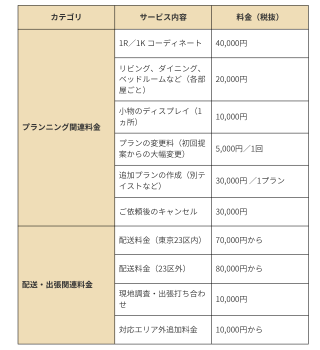 MAYSのインテリアコーディネートサービスは、家具などの商品代金とは別に、以下の料金が基本となります。