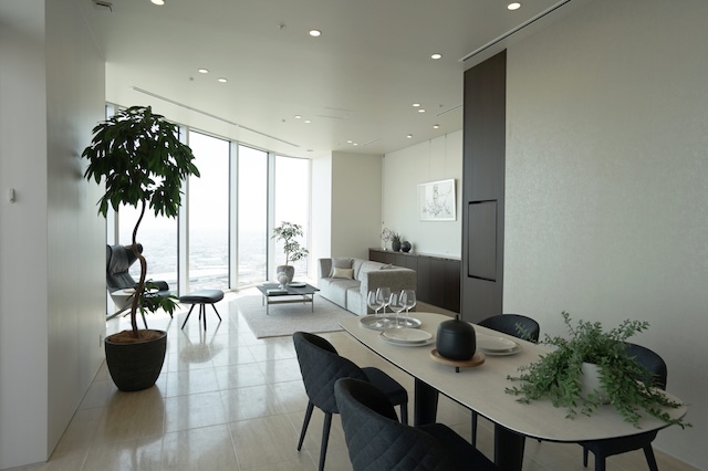 ひとつながりのリビングの向こうには開放的な景色が広がり、大開口から降り注ぐ自然光とダイナミックな眺望が、空間をより広く明るく見せてくれるでしょう。