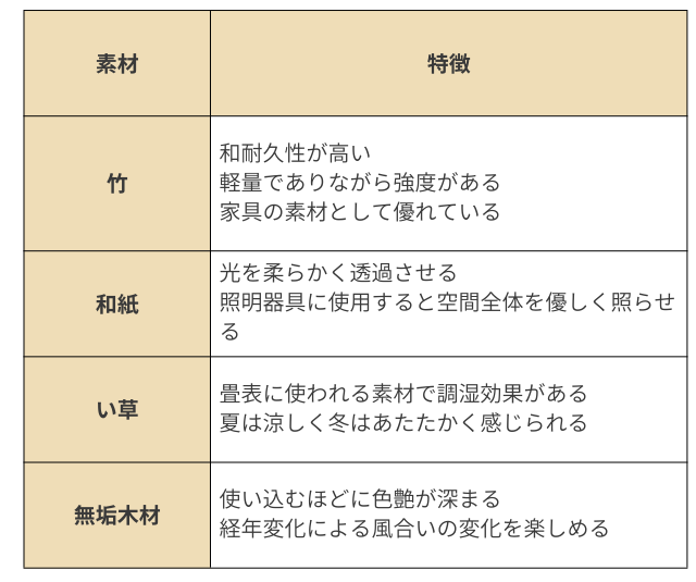 以下に素材の特徴をまとめますので、和モダンに適した商品を選定する際の参考にしてみてください。