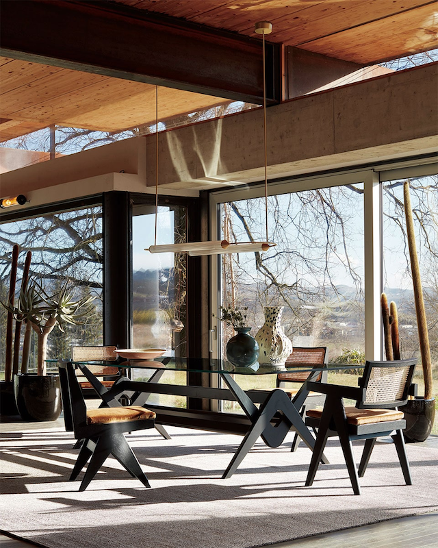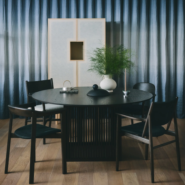 マットブラックの浮造り脚と無垢材天板の組み合わせが、力強く存在感のあるフォルムを生み出します。