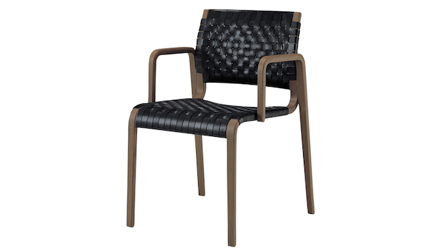 竹建築と畳の模様から着想を得た細木の背面と、ペーパーコードを編み込んだ肘掛けが特徴です。