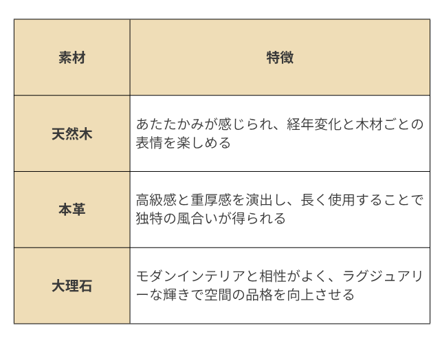 天然木や本革、大理石といった高級素材は、本物ならではの質感があり洗練されたインテリア空間を演出します。